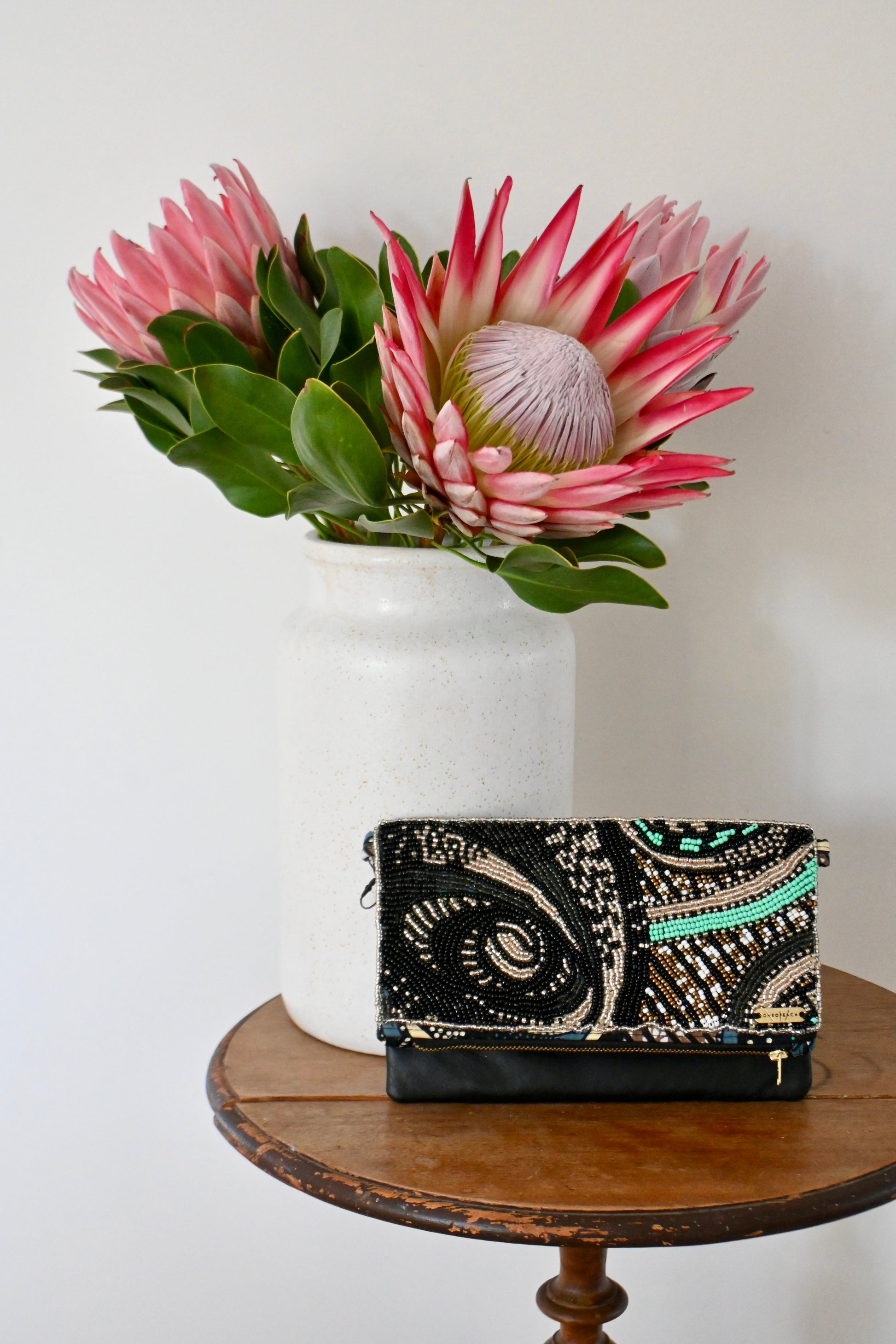 Kleurrijke clutches, in een foldover (gevouwen) model. De clutches zijn handgemaakt van leer met Afrikaanse stoffen, deels belegd met kraaltjes. Geen enkele clutch is hetzelfde en daarom uniek.