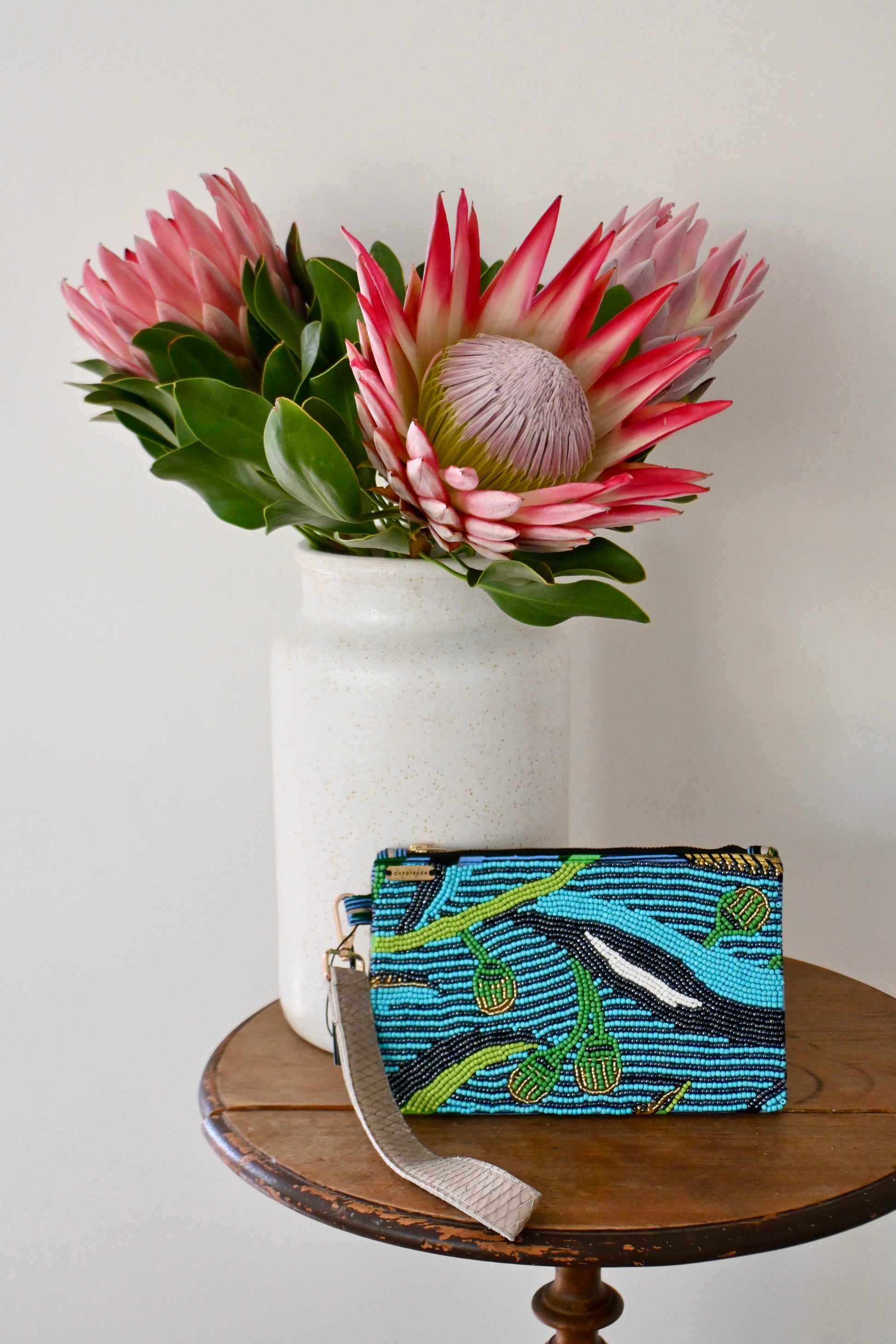 Net als de kleurrijke clutches, zijn deze prachtige tasjes handgemaakt. De voorkant is van een Afrikaanse stof, volledig belegd met kraaltjes. De achterkant is van leer. Elke tasje is uniek.