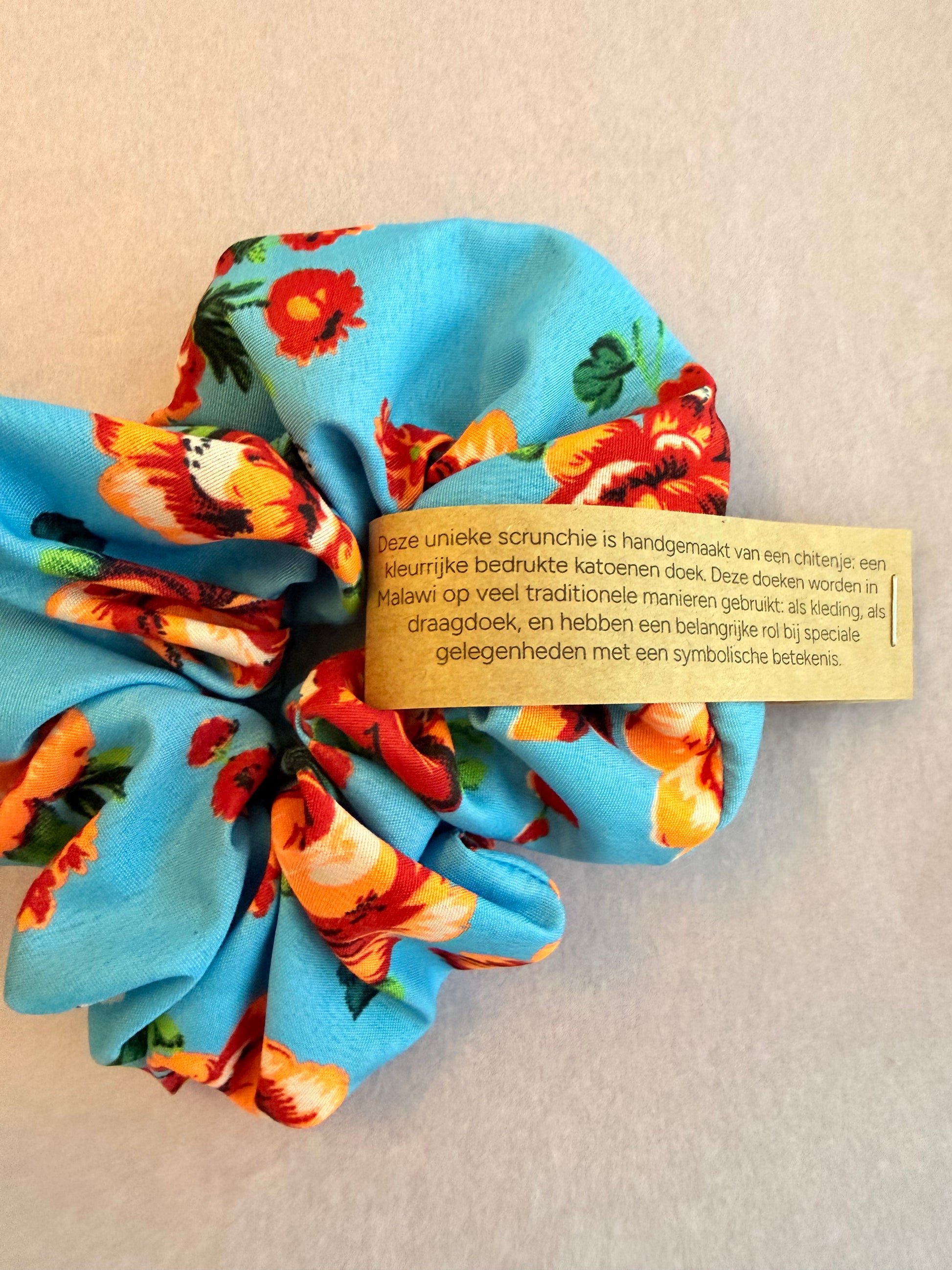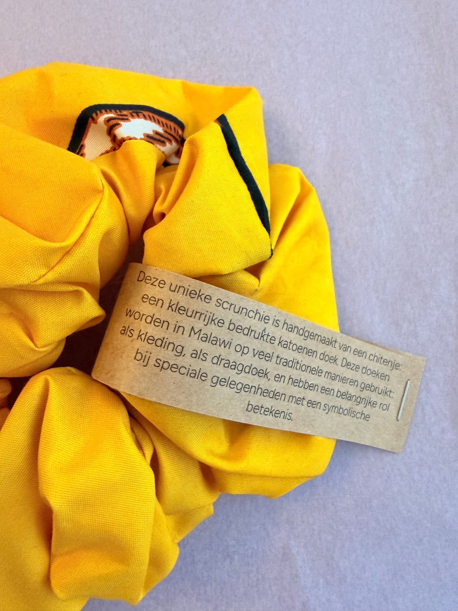 Deze unieke scrunchies zijn handgemaakt van een chitenje: een kleurrijke bedrukte katoenen doek. Deze doeken worden in Malawi op veel traditionele manieren gebruikt. Zo dragen de vrouwen de doek als rok, als hoofdbedekking of om een baby op de buik of rug te dragen. Chitenjes worden gegeven als kado en hebben een belangrijke rol bij speciale gelegenheden met een symbolische betekenis.